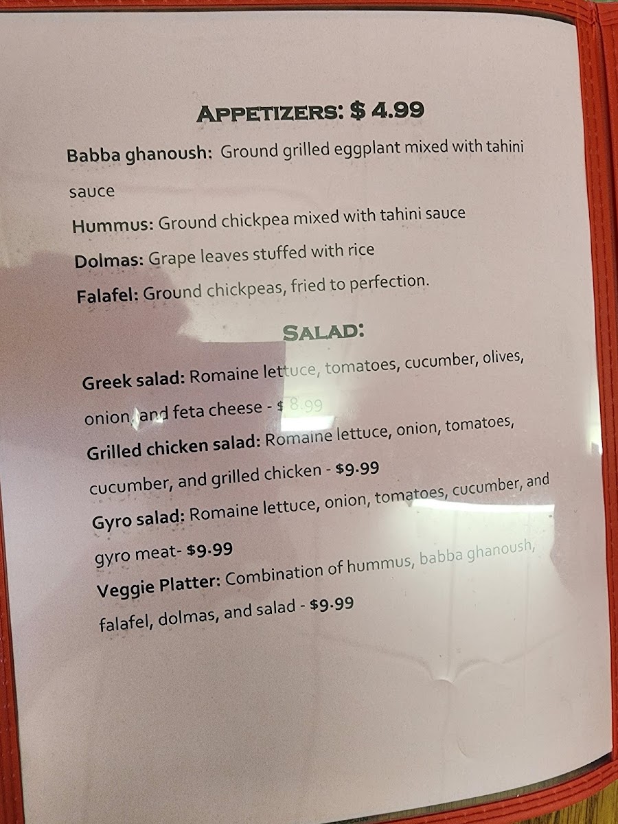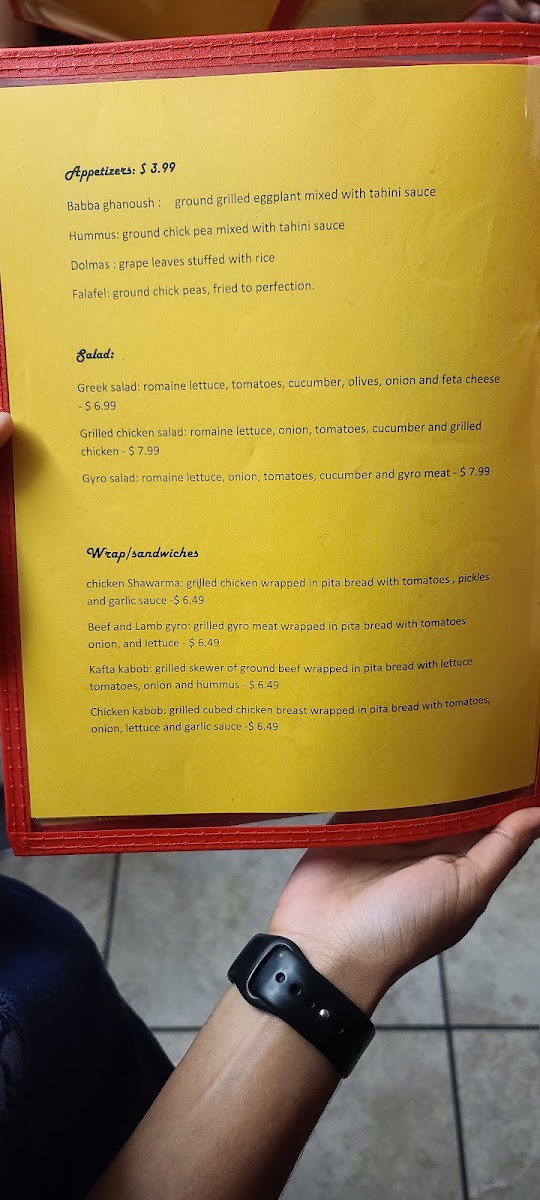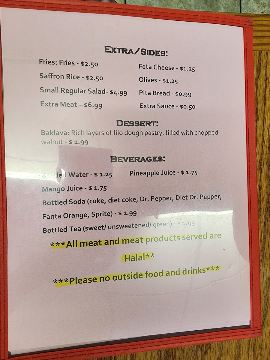 Desserts are also part of the menu, with options like Baklava available for those looking to finish their meal with a traditional sweet.