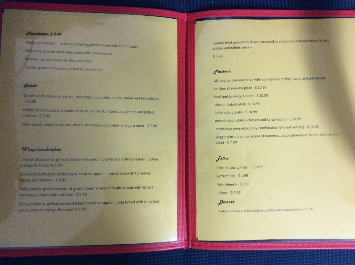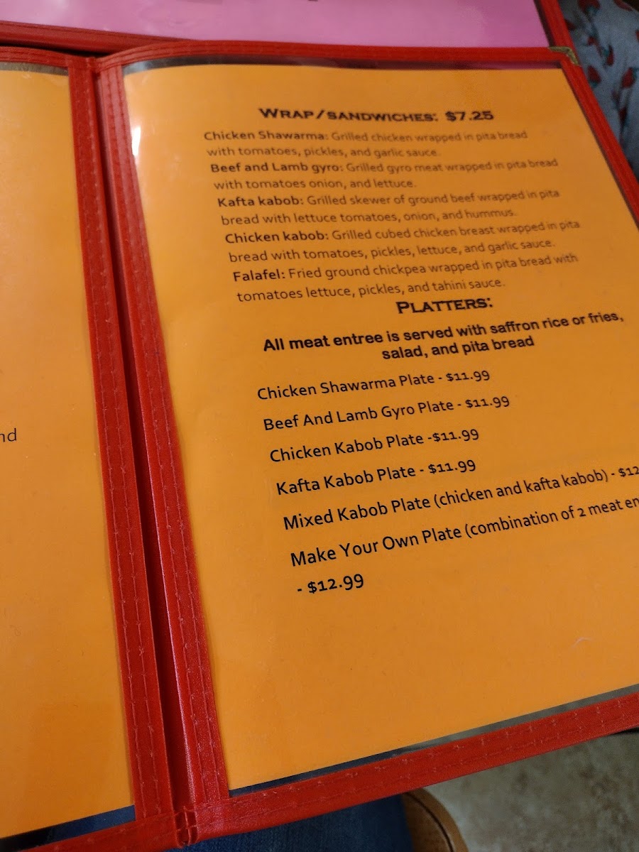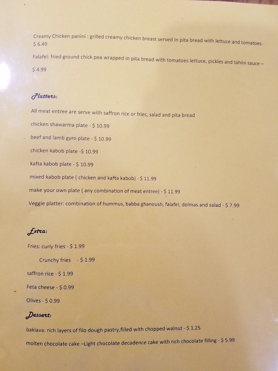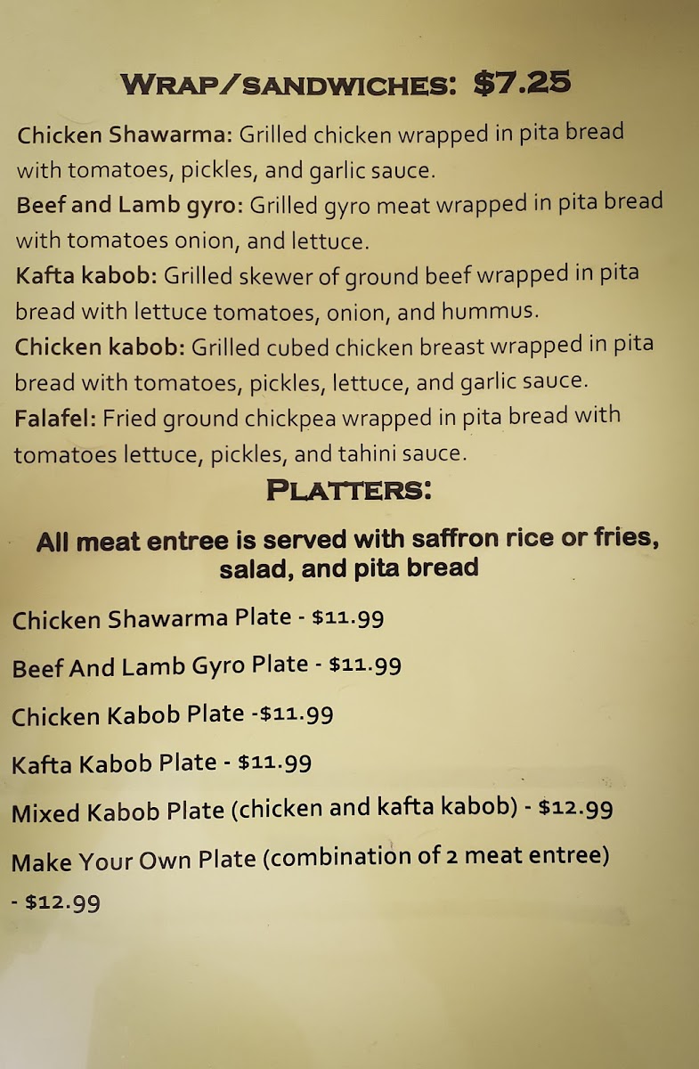 Plates and Platters are available with combinations like Mixed Kabob Plates, Kafta Kabob Plates, Chicken Kabob Plates, and Gyro Platters featuring beef, lamb, or chicken. These are usually served with sides such as saffron rice, pita bread, salad, and dips like hummus and mutabbal.