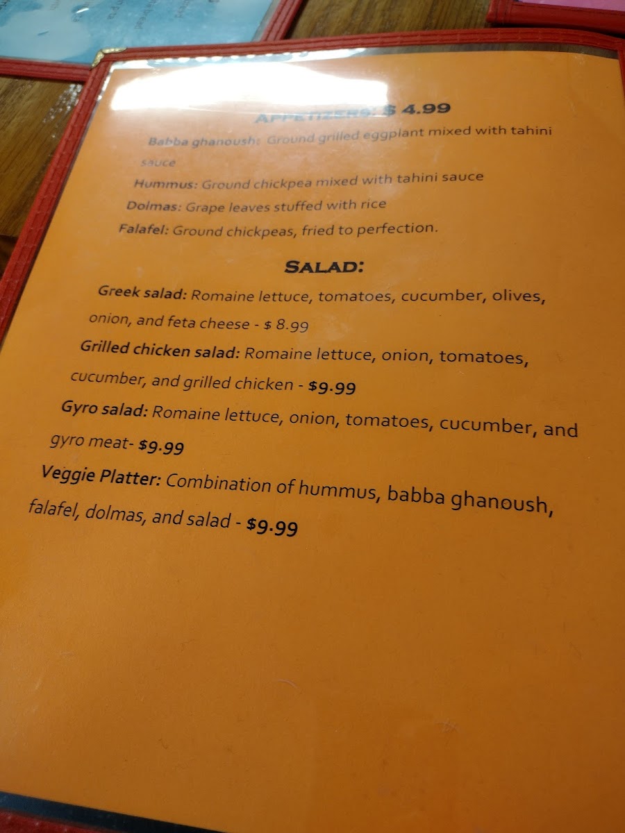The menu is suitable for lunch or dinner, offering options that cater to both quick orders and more leisurely meals. Most dishes combine protein, grains, and salad or dips, reflecting the balanced nature of Mediterranean cuisine.